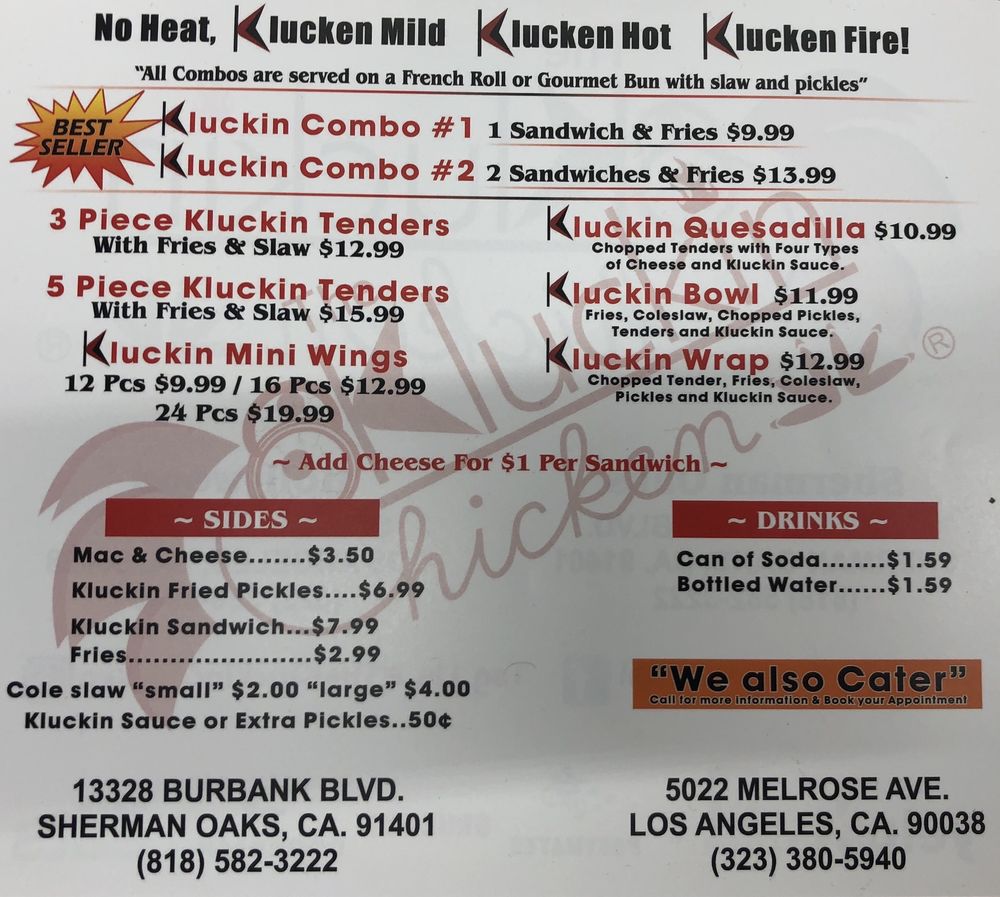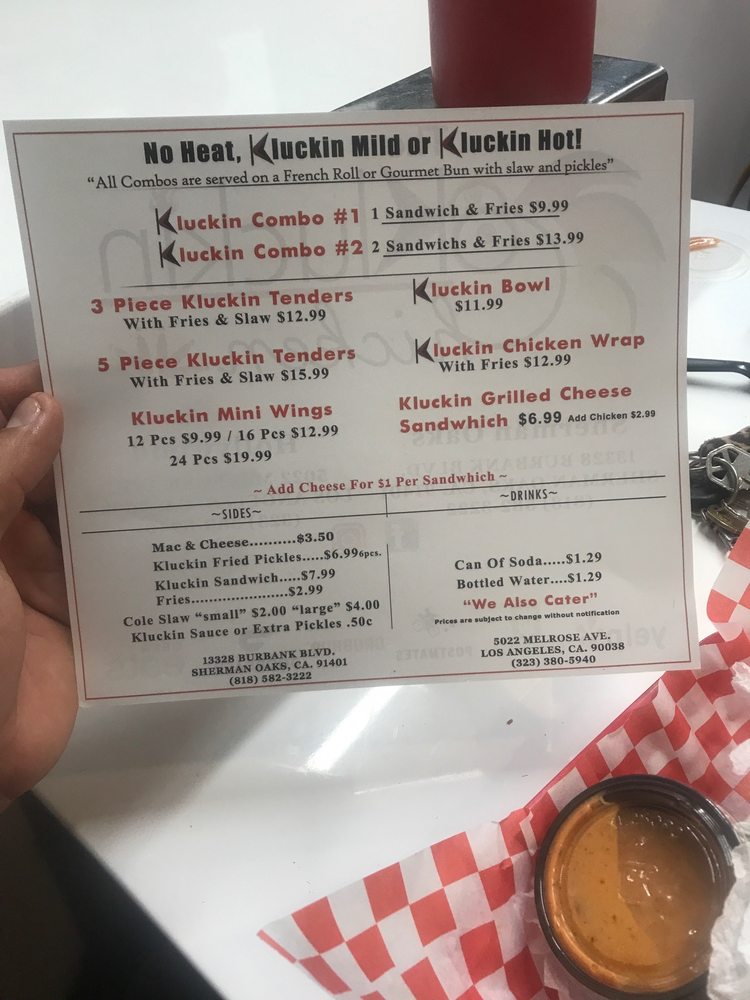 Introducing The Kluckin Chicken, a hipster and casual restaurant in Los Angeles, CA, that offers delicious chicken sandwiches and wraps. With a focus on quality and customer service, The Kluckin Chicken provides a clean and welcoming atmosphere for all diners. The menu features a variety of chicken options, including the popular Kluckin sandwich combo and Nashville hot chicken. Customers rave about the seasoned fries and quick service, making it a great spot for lunch, dinner, or late-night cravings. The restaurant also offers delivery, takeout, and catering services, catering to a wide range of dining needs. Whether you're looking for a tasty chicken dish or a flavorful side, The Kluckin Chicken is a must-try destination for chicken lovers.